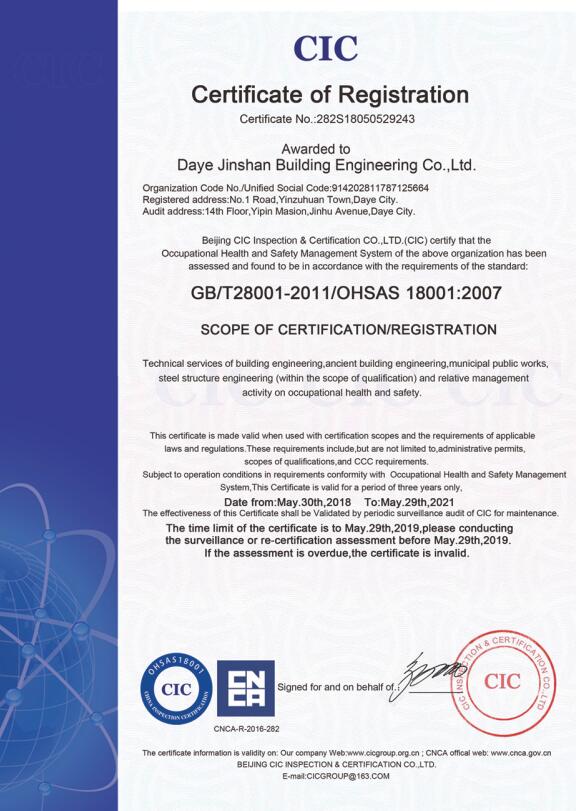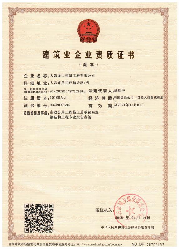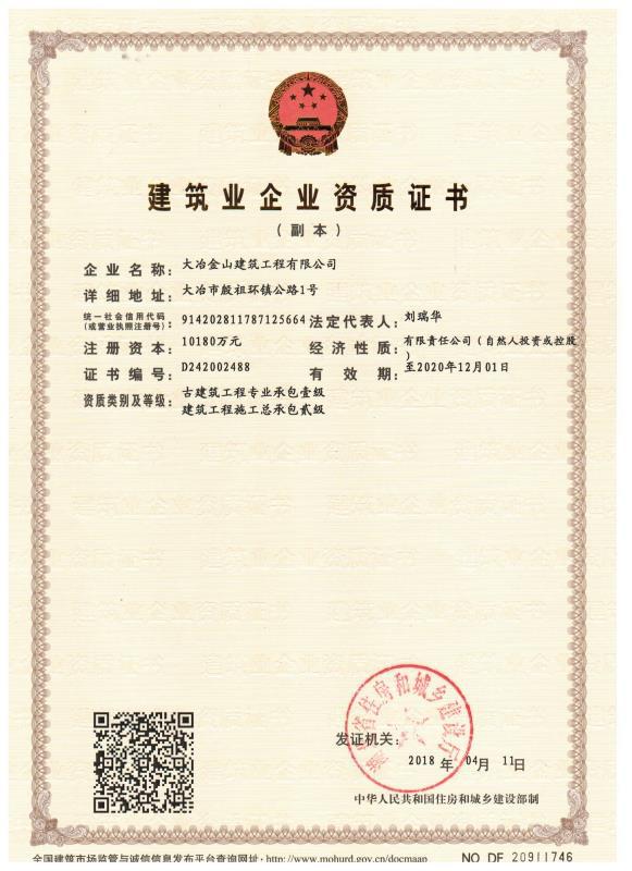 大冶金山建筑工程有限公司始建于1984年,屬鎮(zhèn)辦集體企業(yè)。1997年改制為大冶山建筑工程有限責(zé)任公司,屬股份制企業(yè)。2013年更名為大冶金山建筑工程有限公司,2018年3月公司資源重組,公司注冊(cè)資金達(dá)到10180.00萬元,公司法定代表人為劉瑞華。公司具有古建筑工程專業(yè)承包壹級(jí)、建筑工程施工總承包貳級(jí)、市政工程總承包叁級(jí)、鋼結(jié)構(gòu)工程專業(yè)承包叁級(jí)資質(zhì)。